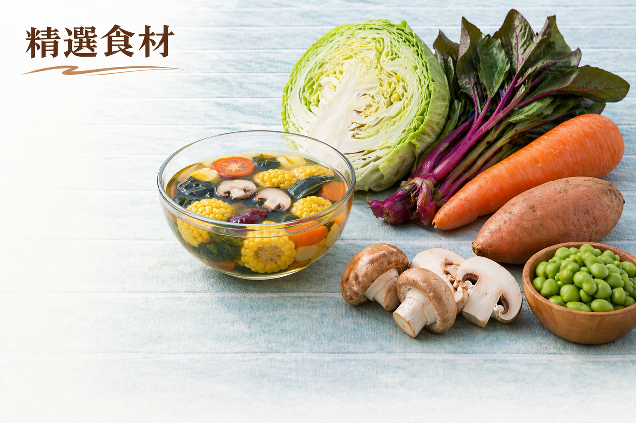 以蔬菜湯(昆布、胡蘿蔔、鮮香菇、金黃玉米)為基底慢火燉煮