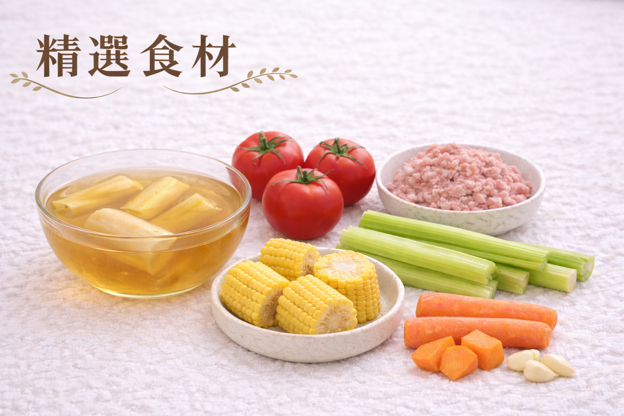 成 分: 排骨甘蔗高湯、白米、牛蕃茄、豬肉(產地 台灣)、小米、胡蘿蔔、西洋芹菜、蒜仁