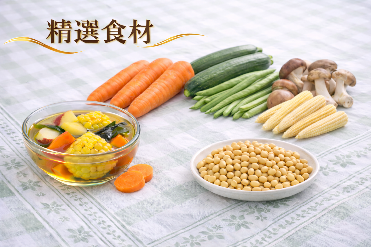 成 分:黃豆白飯、蔬菜湯(蘋果、金黃玉米、昆布、胡蘿蔔)、胡蘿蔔、四季豆、綠櫛瓜、香菇、玉米筍