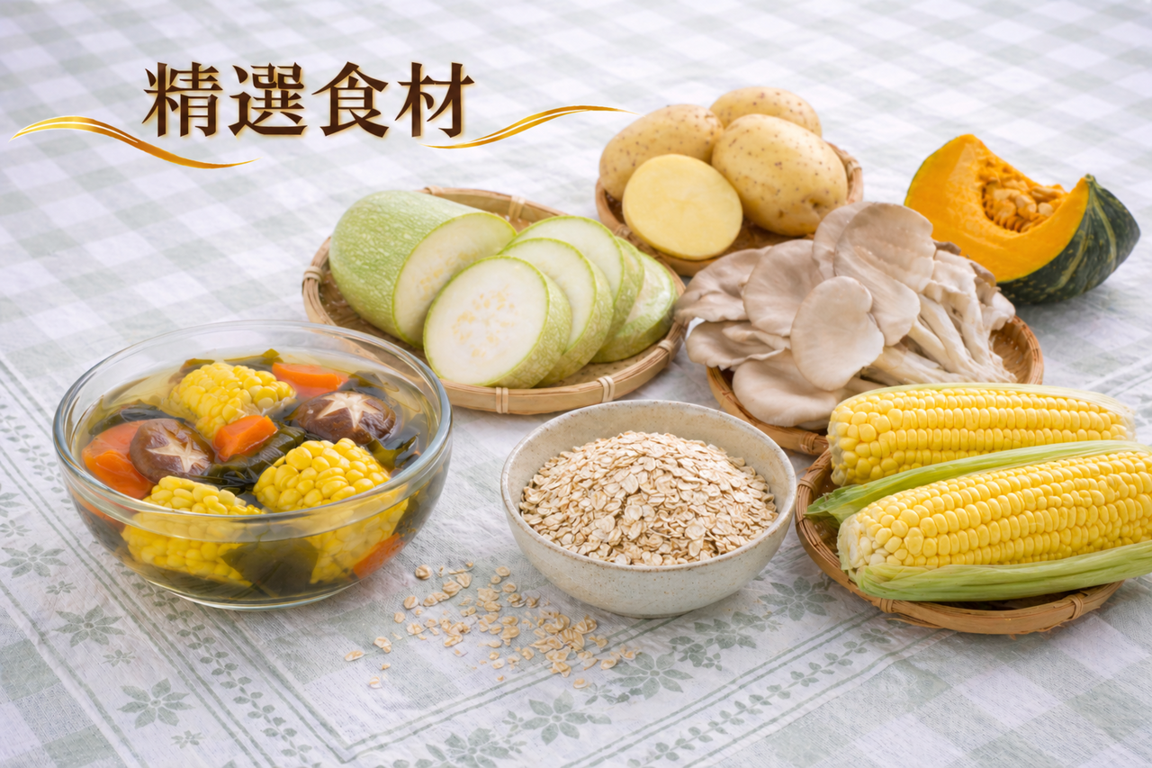 花蒲瓜、南瓜、馬鈴薯、秀珍菇與甜玉米,多種食材自然融合,營養更加均衡豐富