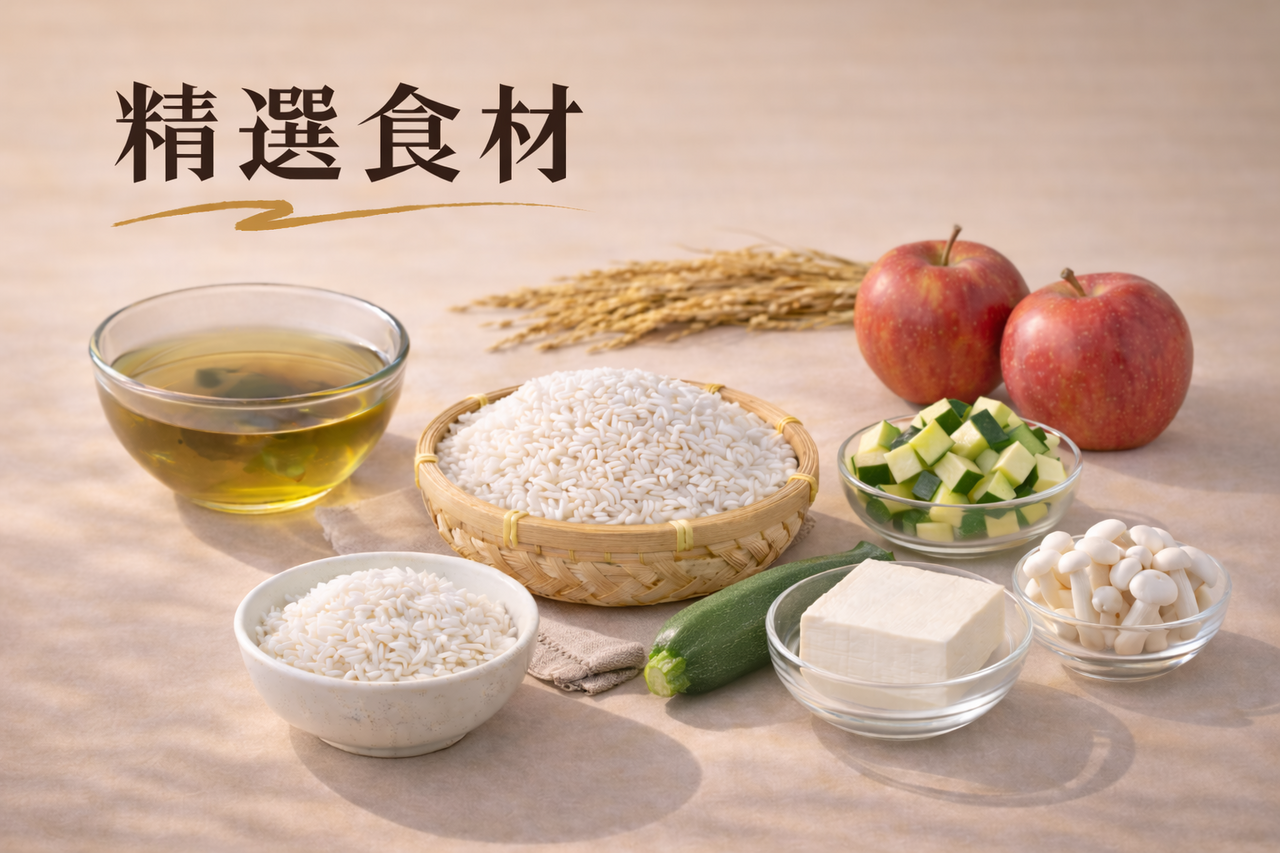 成          分:   昆布湯、白米、蘋果、綠櫛瓜、板豆腐、雪白菇
