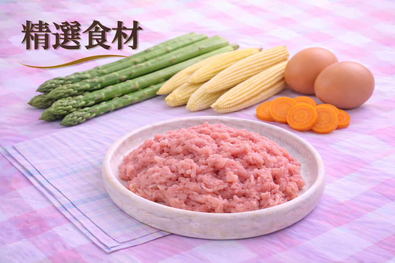成 分: 開水、白米、綠蘆筍、玉米筍、豬絞肉(產地 台灣)、胡蘿蔔、雞蛋