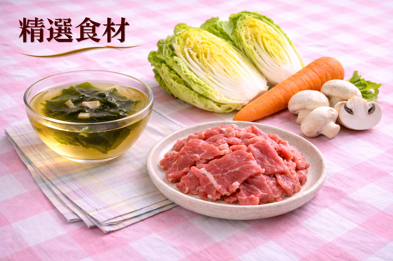 成 分: 海帶芽雞湯、白米、娃娃菜、胡蘿蔔、洋菇、牛肉 (產地 台灣雲林溫體牛)
