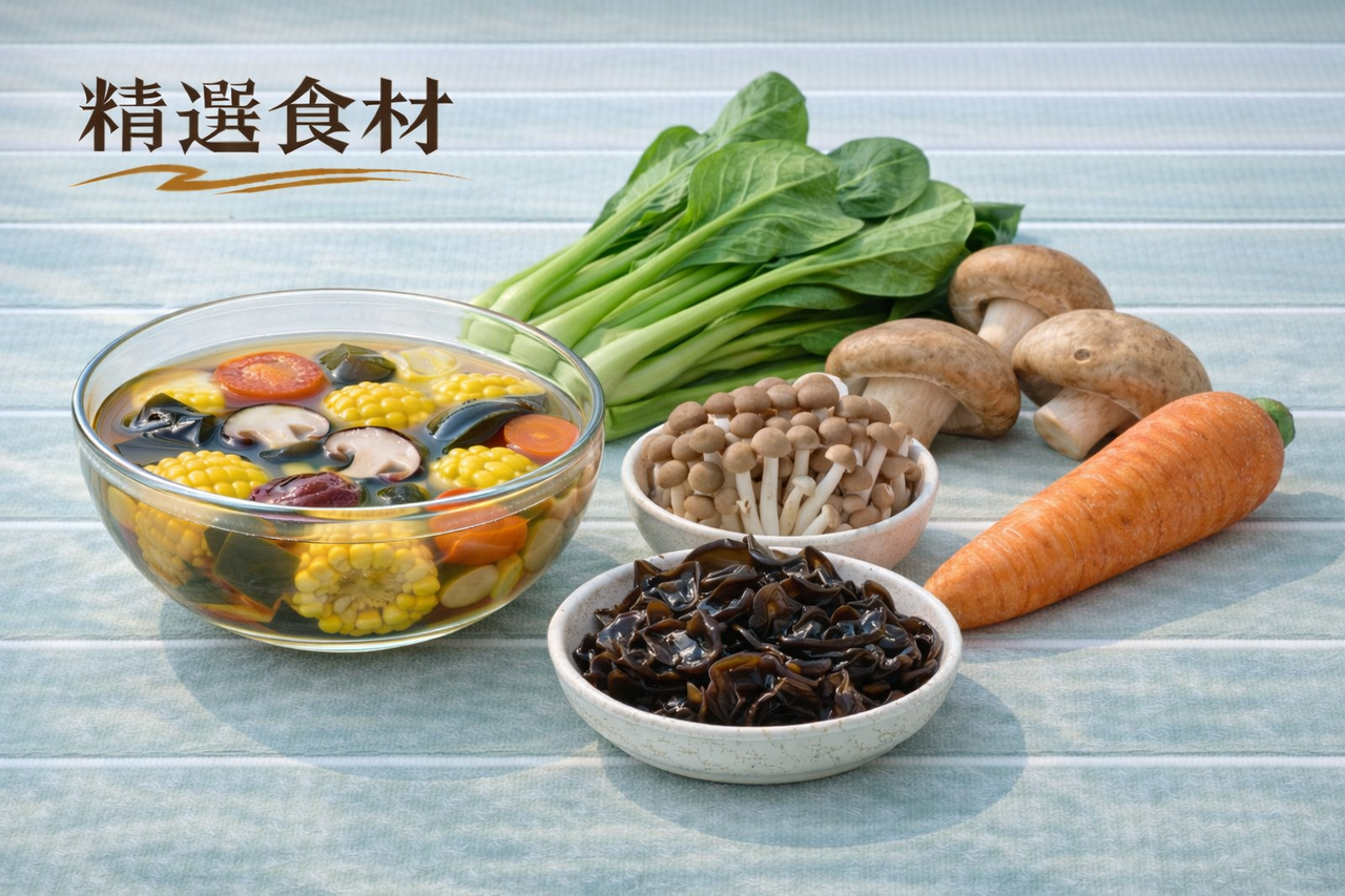 成 分: 蔬菜湯(昆布、胡蘿蔔、鮮香菇、金黃玉米)、白米、小松菜、香菇、黑木耳、鴻喜菇、胡蘿蔔